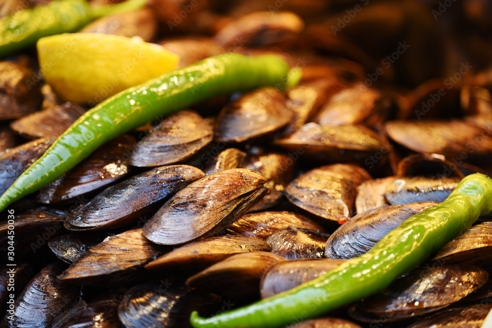 Mussels with vegetables. Street traditional food. Istanbul. Turkey.