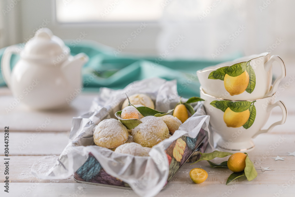 Lemon cookie in a metal box on a white wooden table