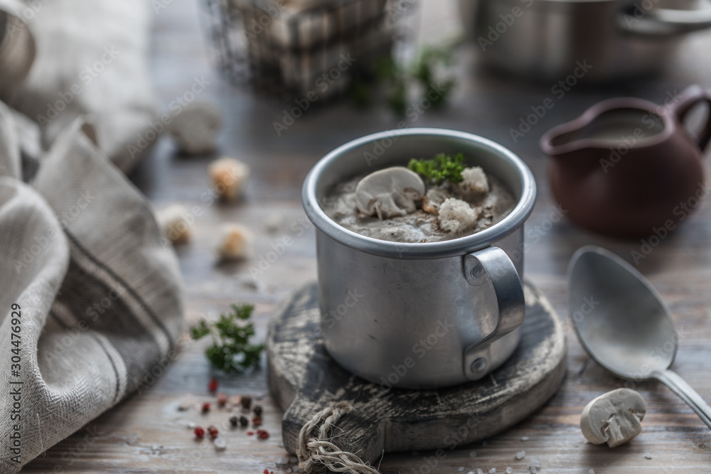 Hot mushroom cream soup of champignons with steam in a metal mug