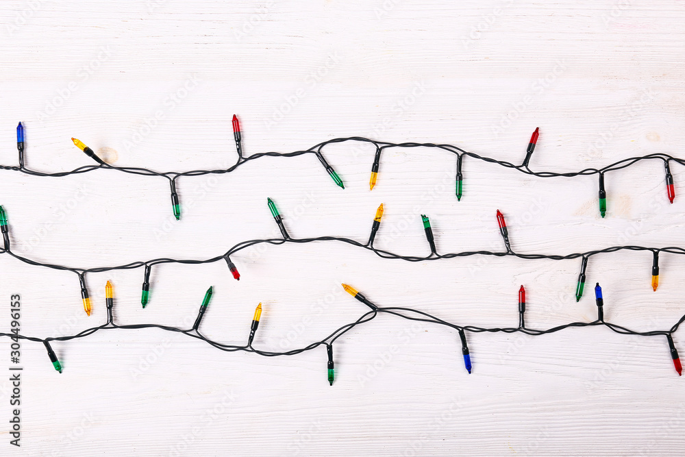 Christmas background concept. New year decoration lights, garland with many small lamps of different color shine on grey grunged wooden table. Top view, flat lay, copy space.