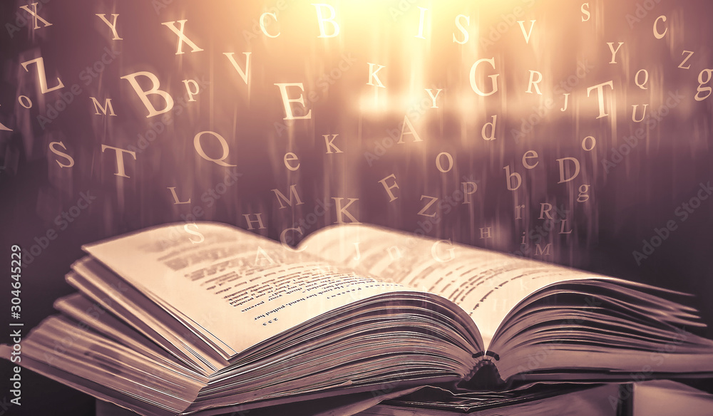 Imagine opening an old book blurred with magic power on the table and the English alphabet floating above the book with magic light as a beautiful background design.