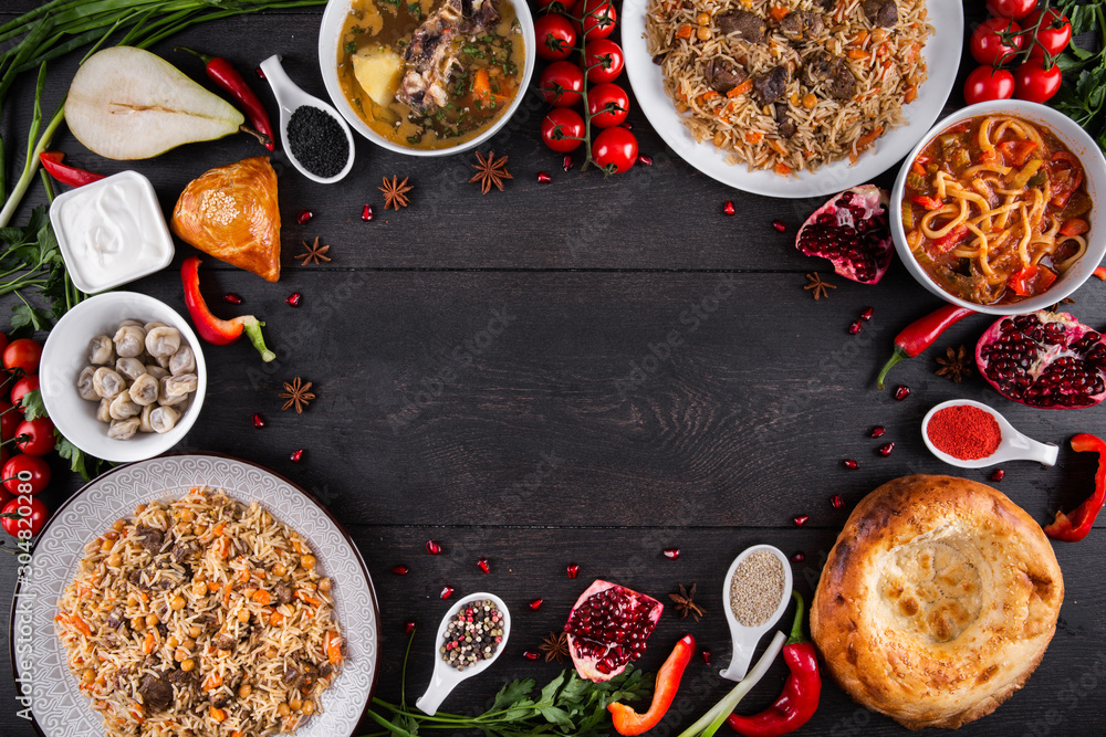 The concept of Eastern asian festive cuisine. Assorted Uzbek food set, pilaf, samsa, lagman, manti, shurpa restaurant concept Eastern arabic new year and Christmas dish from lamb served cookware.