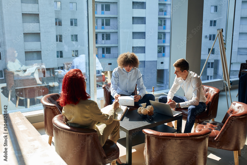 A trading company business meeting with a client, two caucasian men and a woman discussing their preposterous at the office. Reading documents and making notes. Working together.