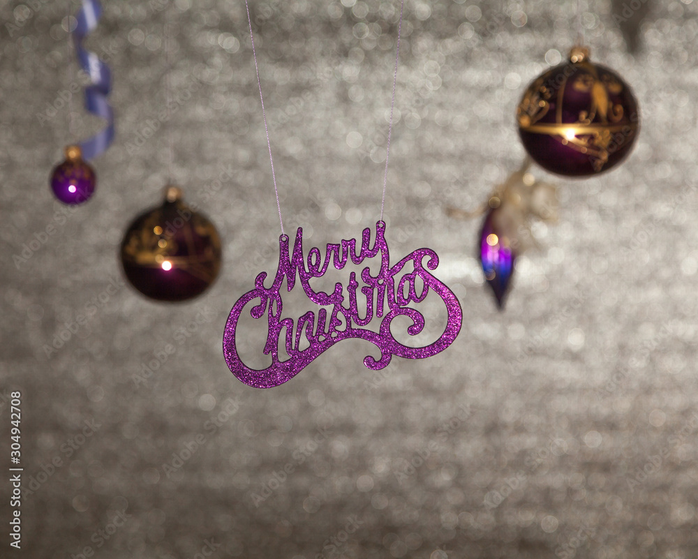 Inscription Merry Christmas on shiny background. Near Christmas toys