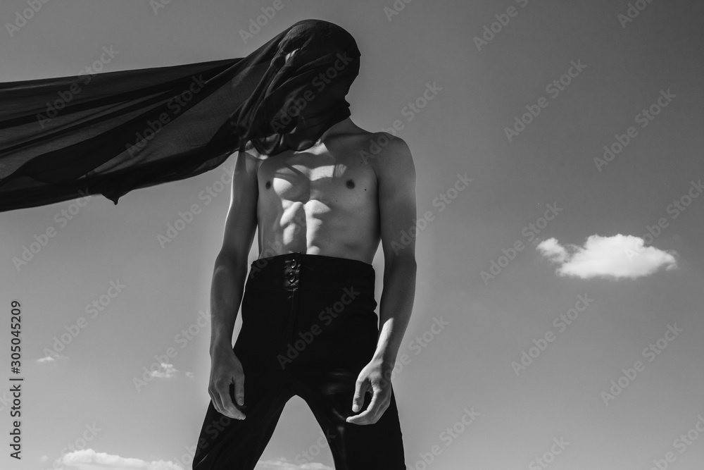 Black and white Muscle strong beautiful stripped male model portrait on plain air location