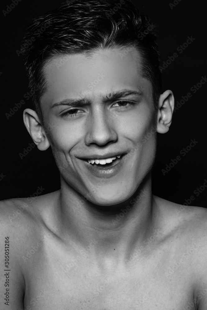 Muscle strong beautiful stripped male model portrait on isolated font background with shadow