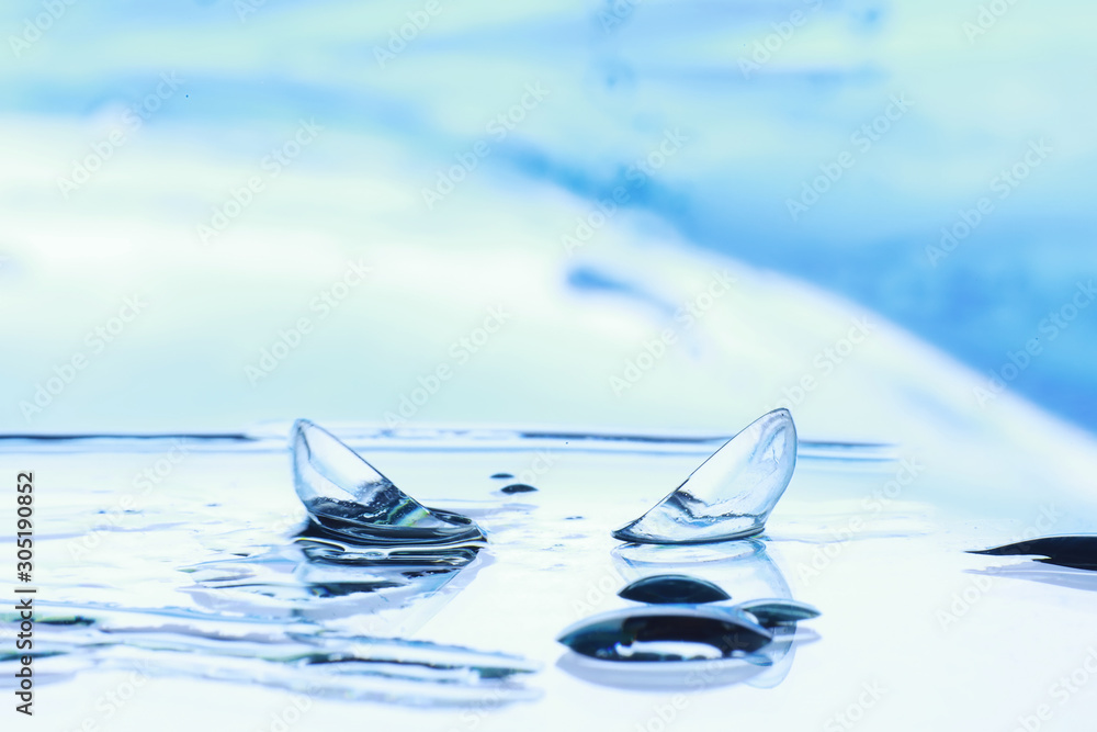 Tools for vision correction. Glasses and lenses with diopters on the background of splashes and blurry.