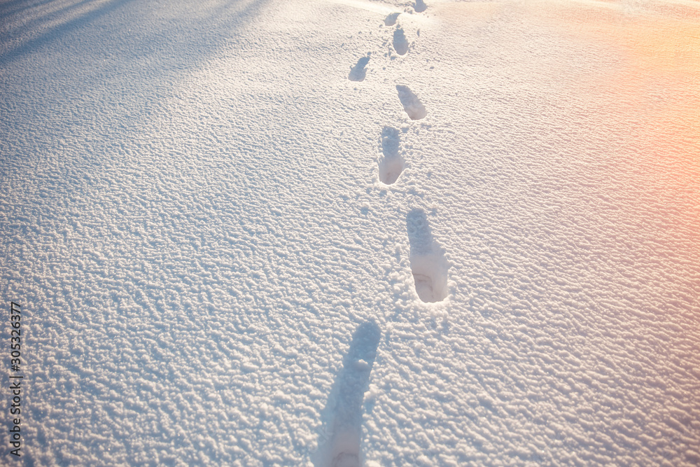 Winter scene. Footprints in the snow in the winter, in the sunset