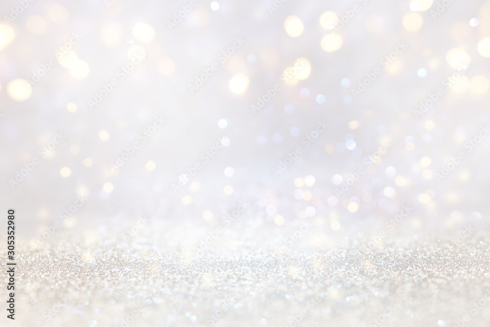 abstract background of glitter vintage lights . silver, gold and white. de-focused