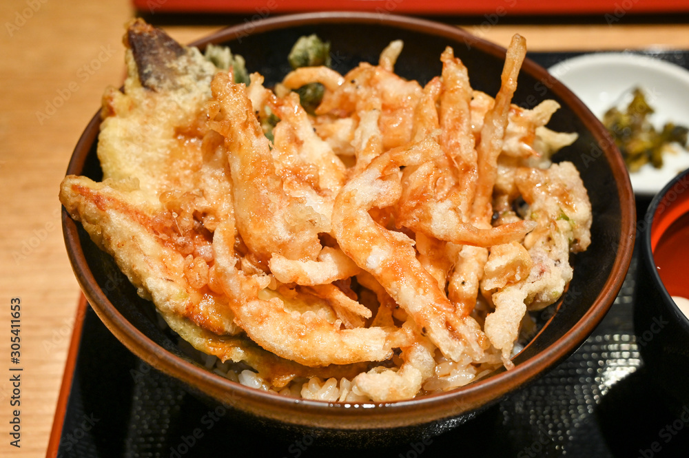 Fried white shrimp on rice, traditional meal in Toyama, Japan