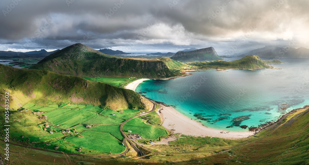 turquoise white sand beach and lush green grass during sunset Norway Loforen
