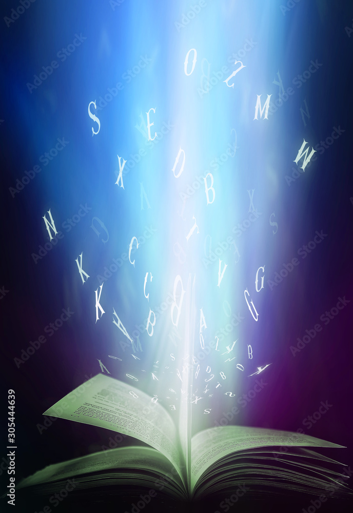 Imagine opening an old book blurred with magic power on the table and the English alphabet floating above the book with magic light as a beautiful background design.