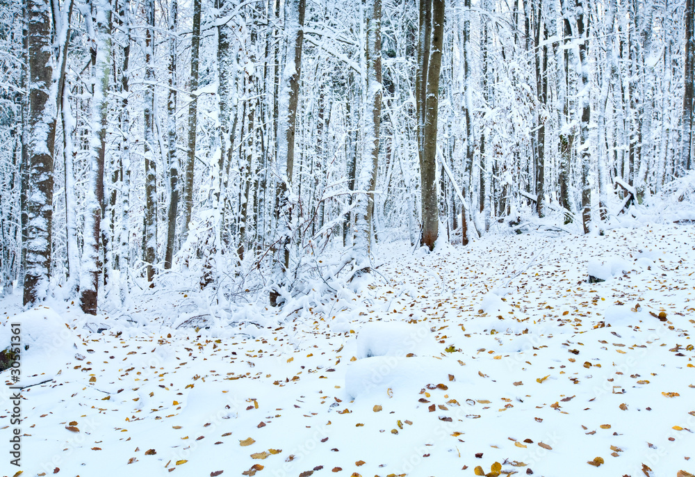 First winter snow and last autumn leafs in forest