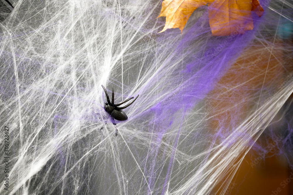 Window dressing for Halloween. The black spider is tangled in an artificial web. Preparations for the celebration of Halloween.