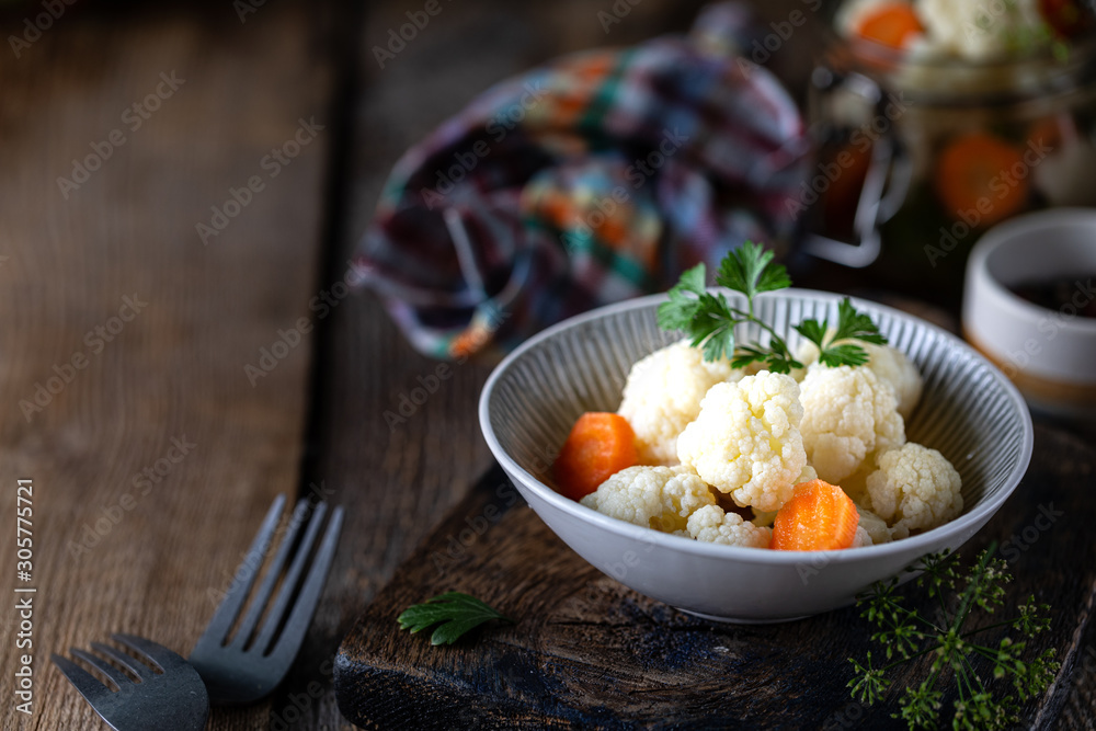 Pickled cauliflower with carrots in a glass jar on a dark wooden table. Fermented food. Copy space.