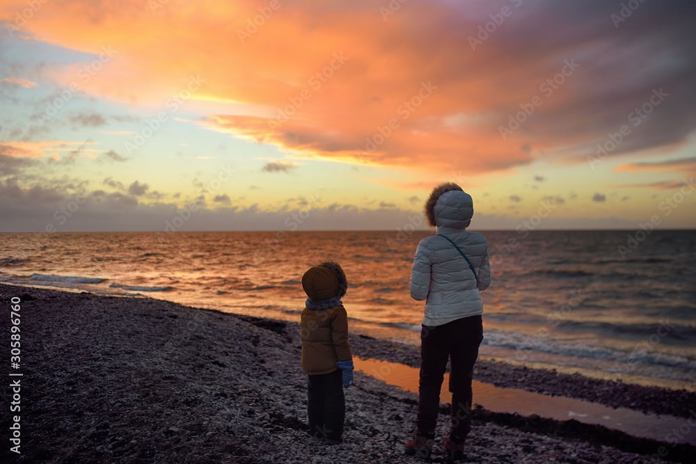 Woman wearing white jacket and little child are walking on Baltic Sea coast on sunset of winter day. Outdoors activity for family with kids in winter.