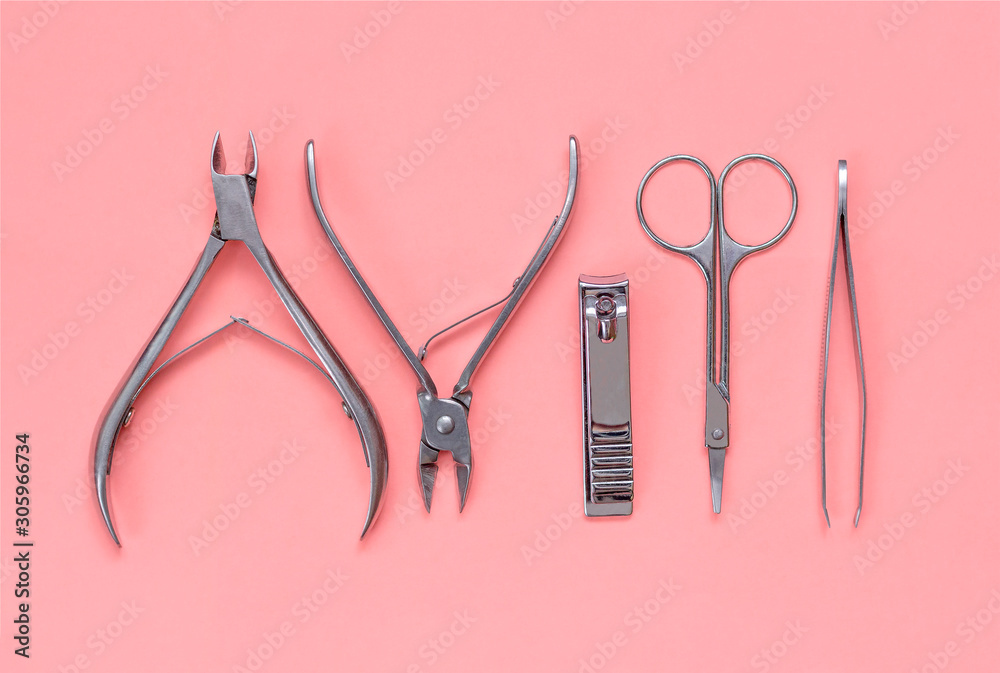 Set of manicure and pedicure tools on pink background. Instrument for nail care: clippers, scissor, tweezer. Beauty concept
