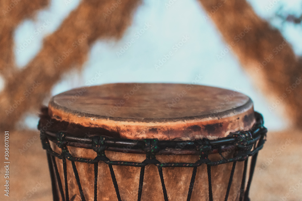 ethnic percussion musical instrument djembe. closeup. selective focus