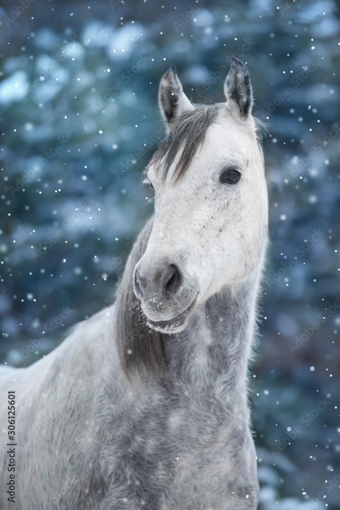 White arabian horse portrait in snow landscape