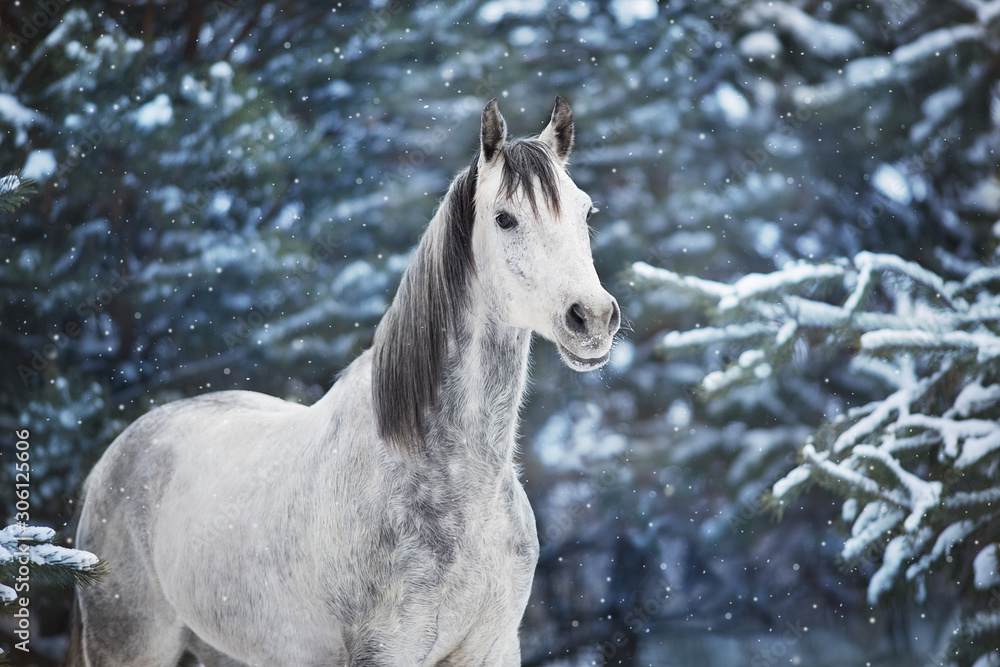 White arabian horse portrait in snow landscape