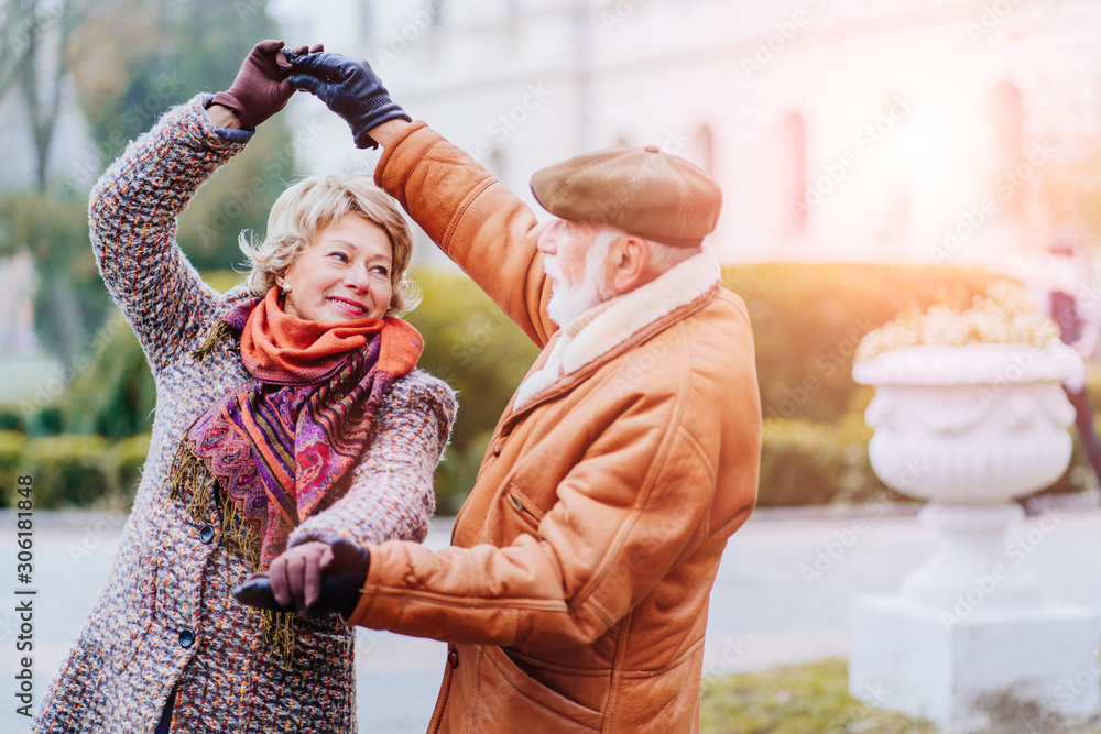 Happy old couple dancing at autumn park.