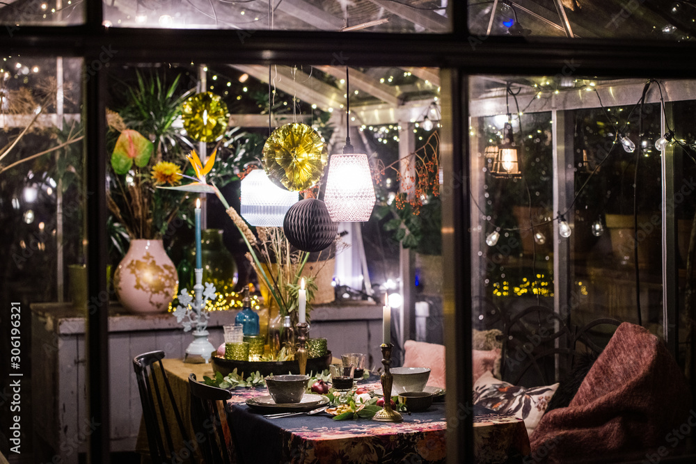 Decorated greenhouse in trendy christmas setting with dinner table, candles and christmas lights.
