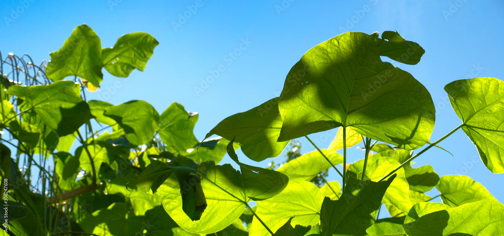 green leaves against the blue sky and the rays of the sun.