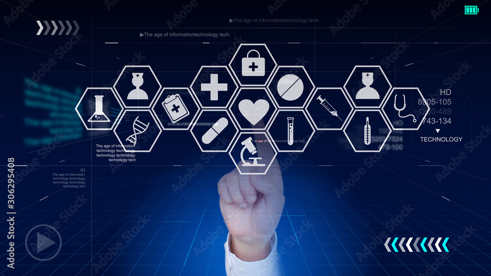Finger touch screen USES AI artificial intelligence modern medical care technology, modern medical technology innovation concept creative diagram.