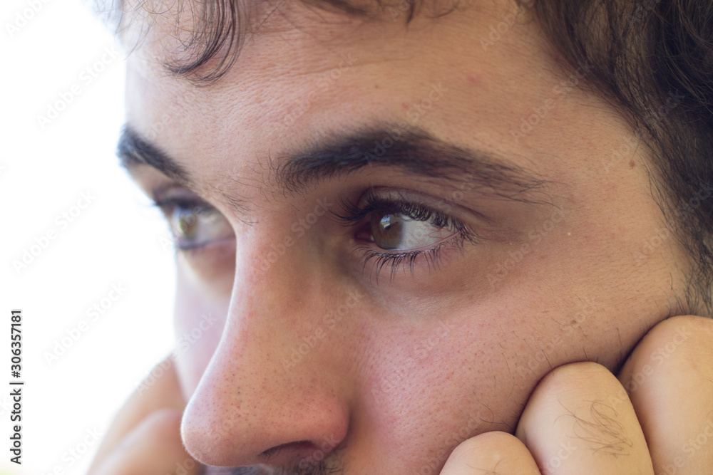 Close-up of Caucasian boy with clear eyes. Focus on the eyes.