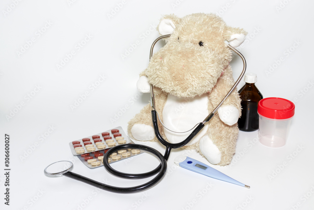 Childhood diseases concept, a teddy hippo with means for treatment fever, pain flu cough and sore throat