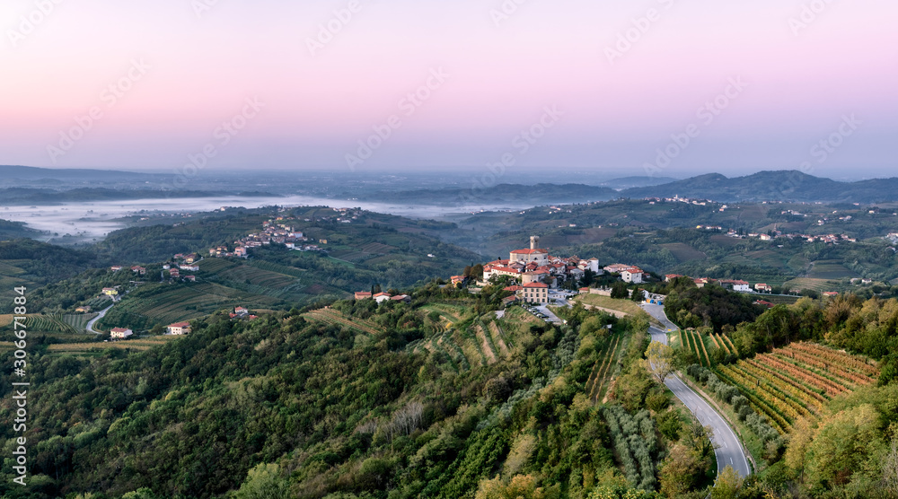 Goriska Brda a famous wine region of Slovenia located near Italy. Sunrise and sunset looking over Smartno village