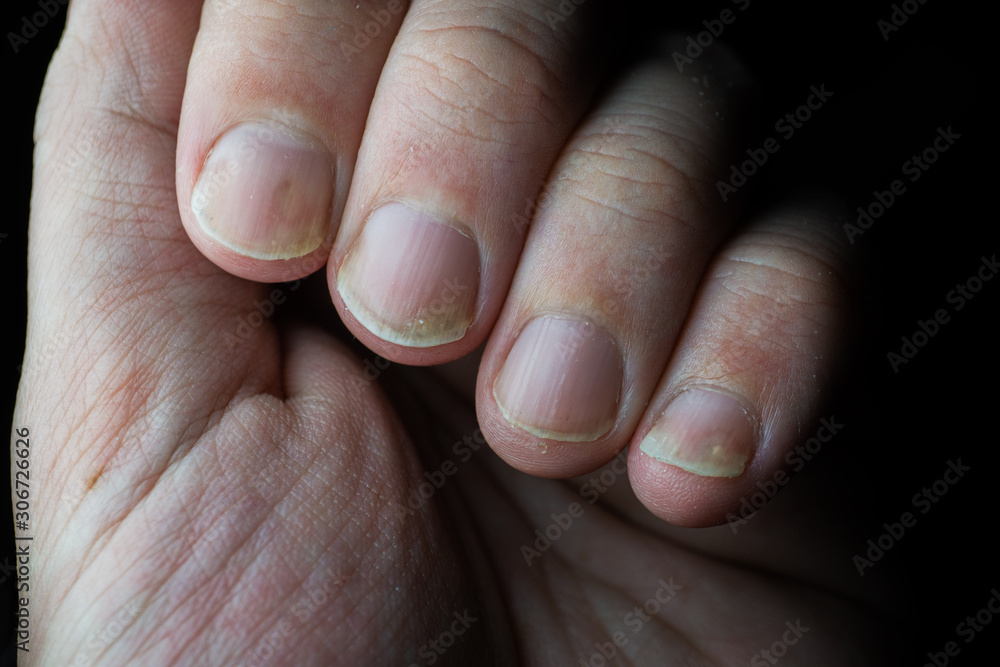 Psoriasis is an autoimmune disease that affects the nail and skin. close up of Psoriasis nail on dark background.