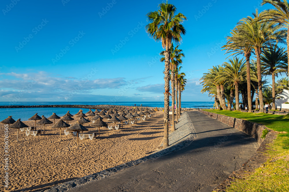 Beach in the tourist resort Playa de las Americas, Tenerife island, Canary Islands, Spain