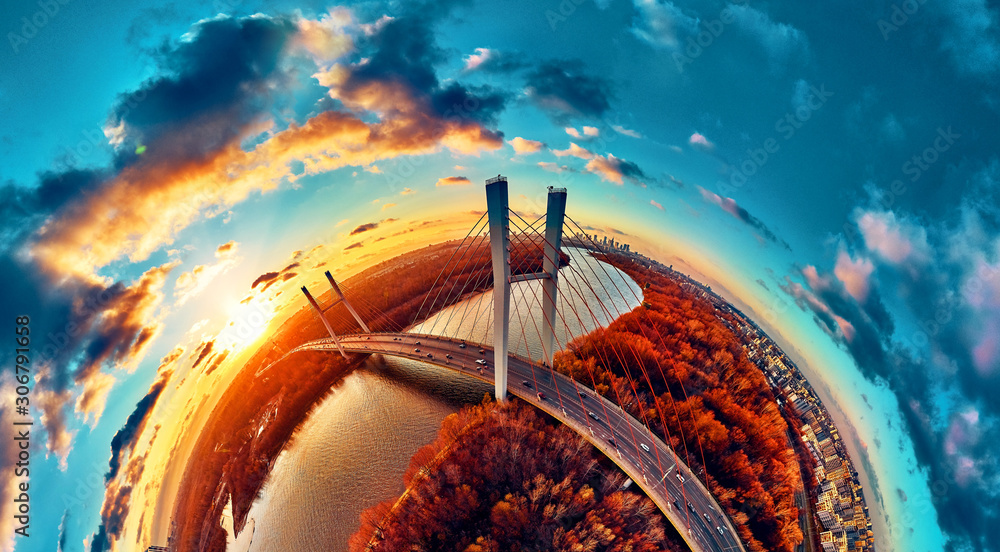 Beautiful panoramic aerial drone view to cable-stayed Siekierkowski Bridge over the Vistula river and Warsaw City skyscrapers, Poland in gold red autumn colors in November evening at sunset