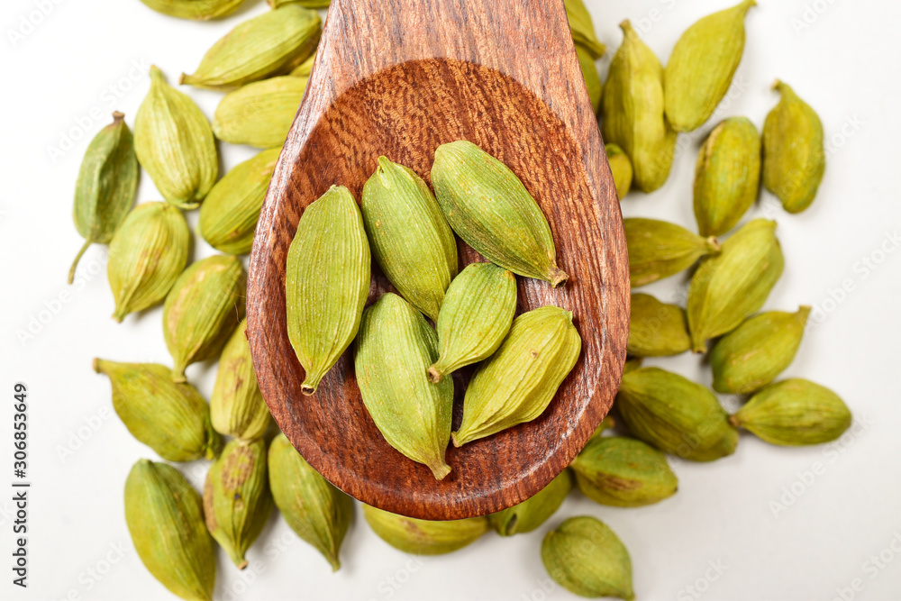 Closeup Of Cardamom In Wooden Spoon