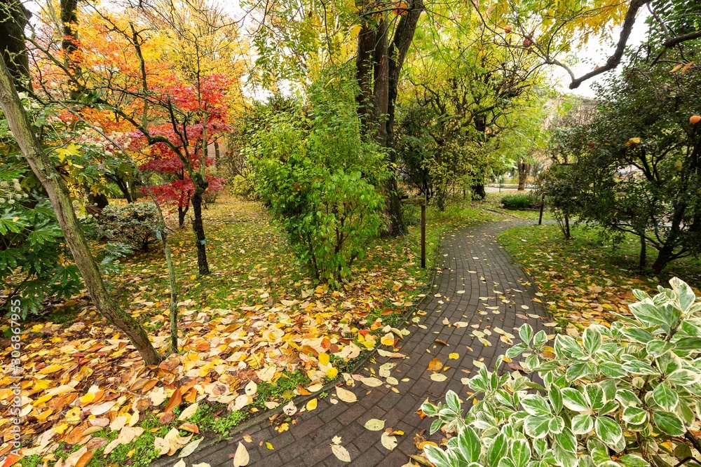 Avenue of a park with trees in autumn full of fallen leaves on the ground