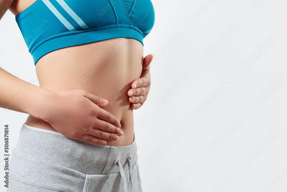 the concept of early pregnancy, proper nutrition, women's health. close-up photo of a slender beautiful belly and navel of a woman. She touches the two palms of her hands to her waist