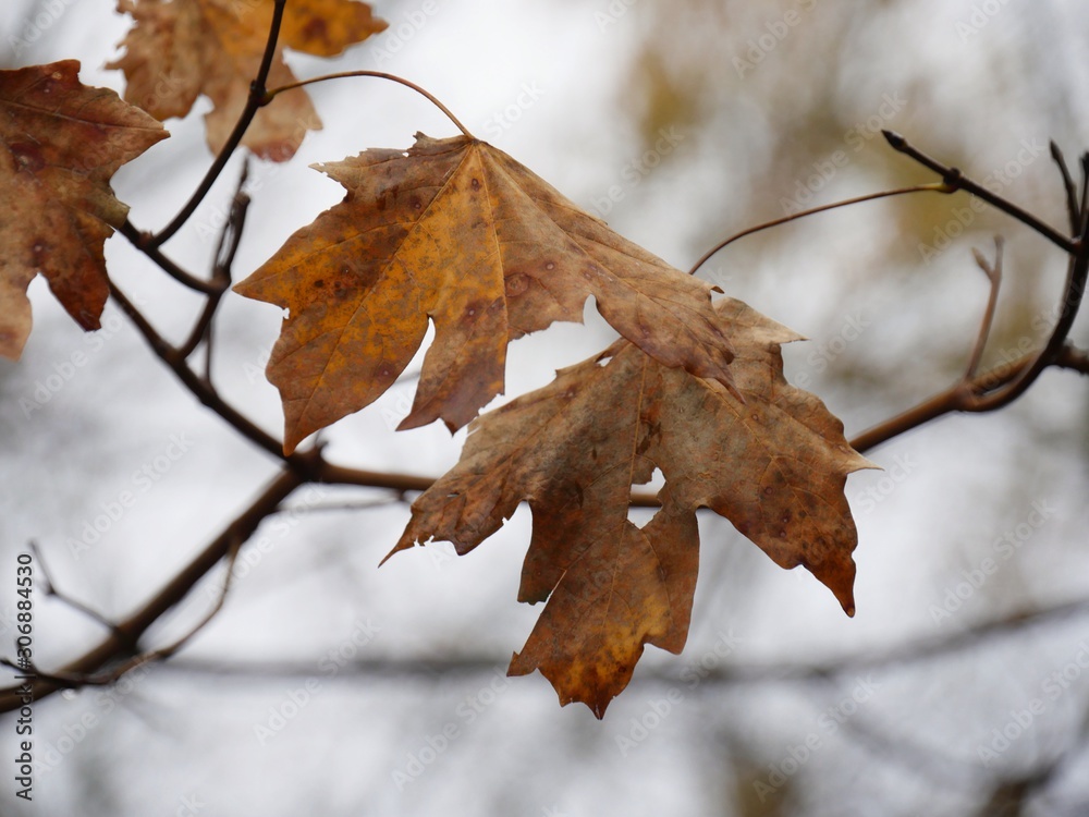 Close up of colorful maple leaves in a tree in autumn, blurred background