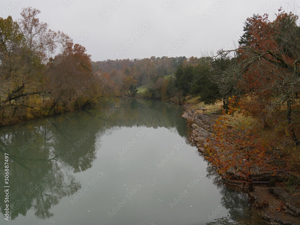 Medium wide shot of the War Eagle River with colorful trees along the banks in autumn