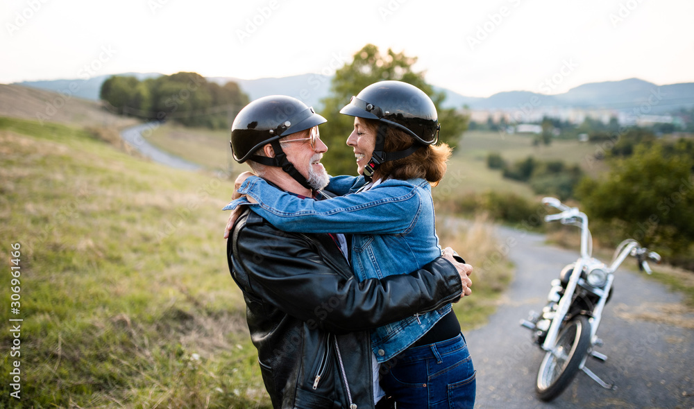 A cheerful senior couple travellers with motorbike in countryside, hugging.