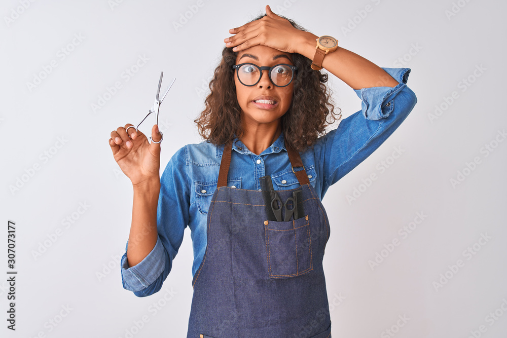 Young brazilian hairdresser woman using scissors standing over isolated white background stressed with hand on head, shocked with shame and surprise face, angry and frustrated. Fear and upset