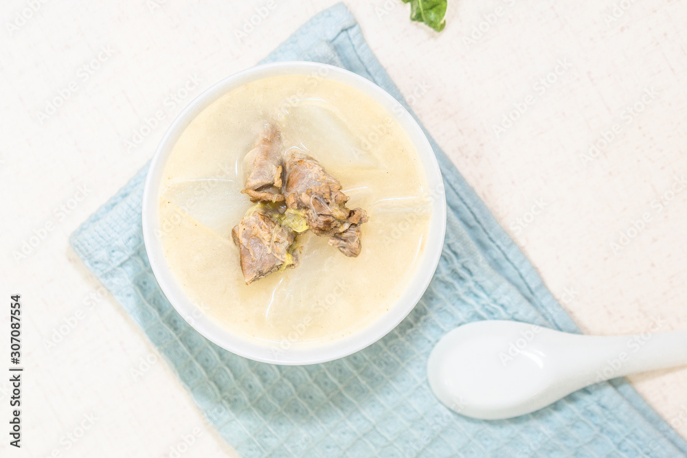 A bowl of mutton stew with radishes was set on the table