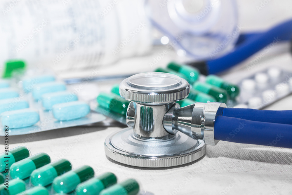 Stethoscopes on the table, empty capsules, medicines, bottles and medical supplies