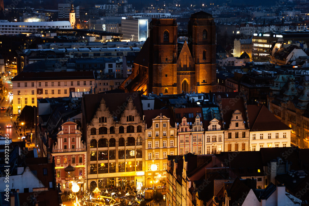 Wroclaw at night at sunset. View from above