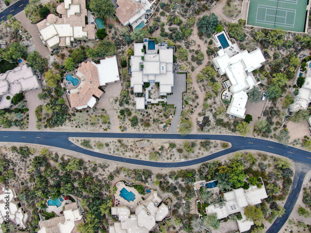 Aerial top view of upscale luxury homes with pool and tennis court in Scottsdale, Phoenix, Arizona