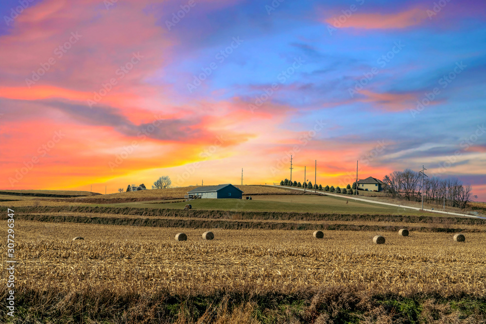 Twilight sunset over a golden field in the middle of Iowa along route 80 in the USA.