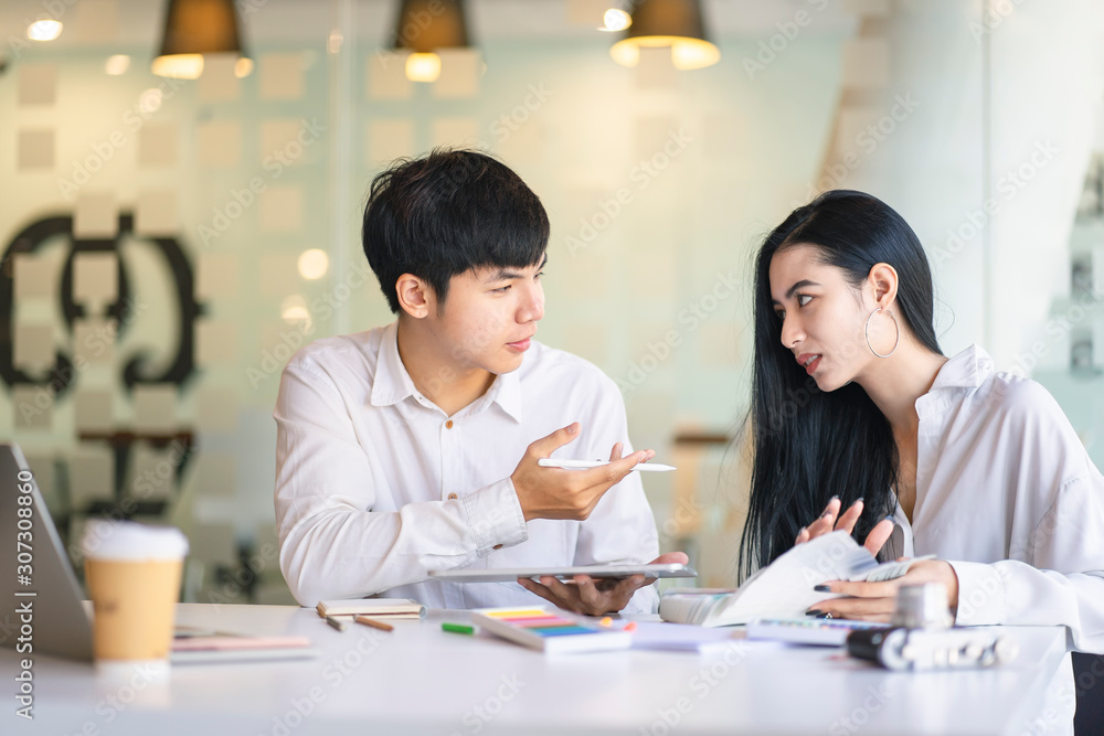 Young Asian business or college student using digital tablet and laptop computer notebook work together at coffee shop or university campus.