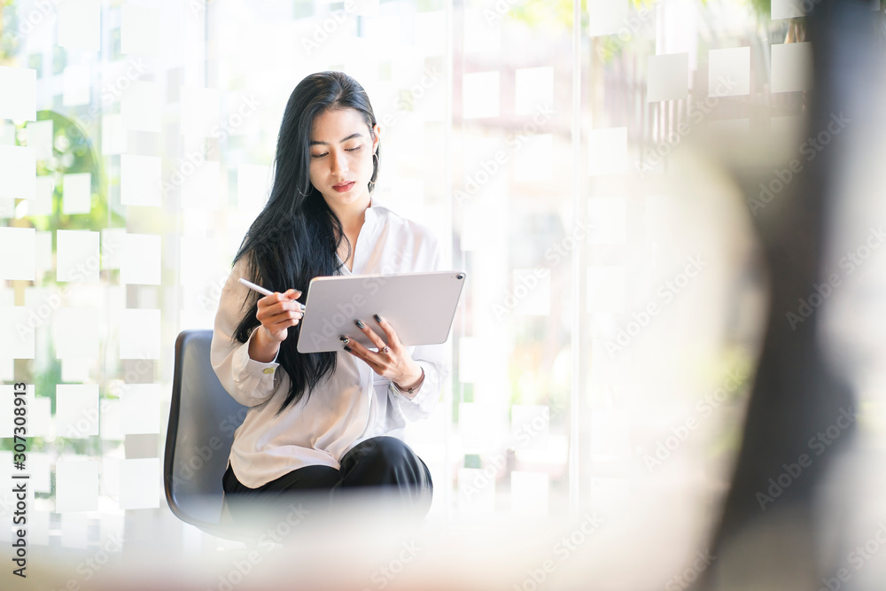Young Asian graphic designer working on graphics tablet in her working space. Young college students reading somthing from her tablet.