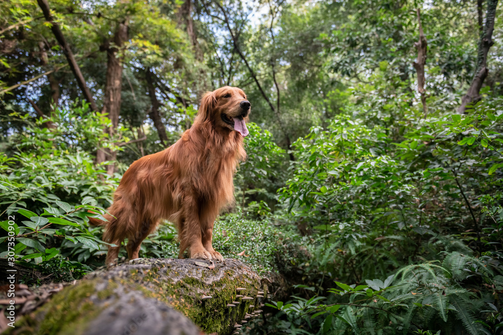Golden retriever playing in the forest