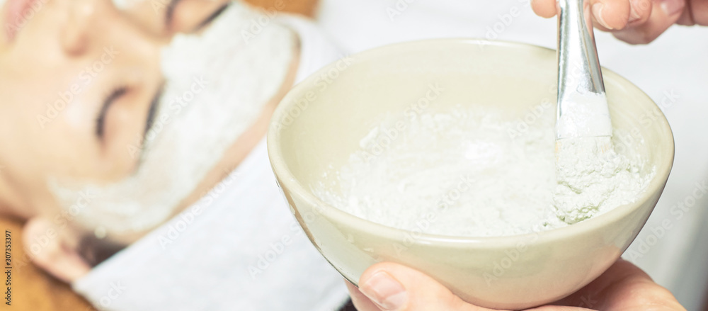 chemic facial peel mask. Cosmetology acne treatment. Young girl at medical spa salon. Brush. Face fruit acid. Sensitive peeling